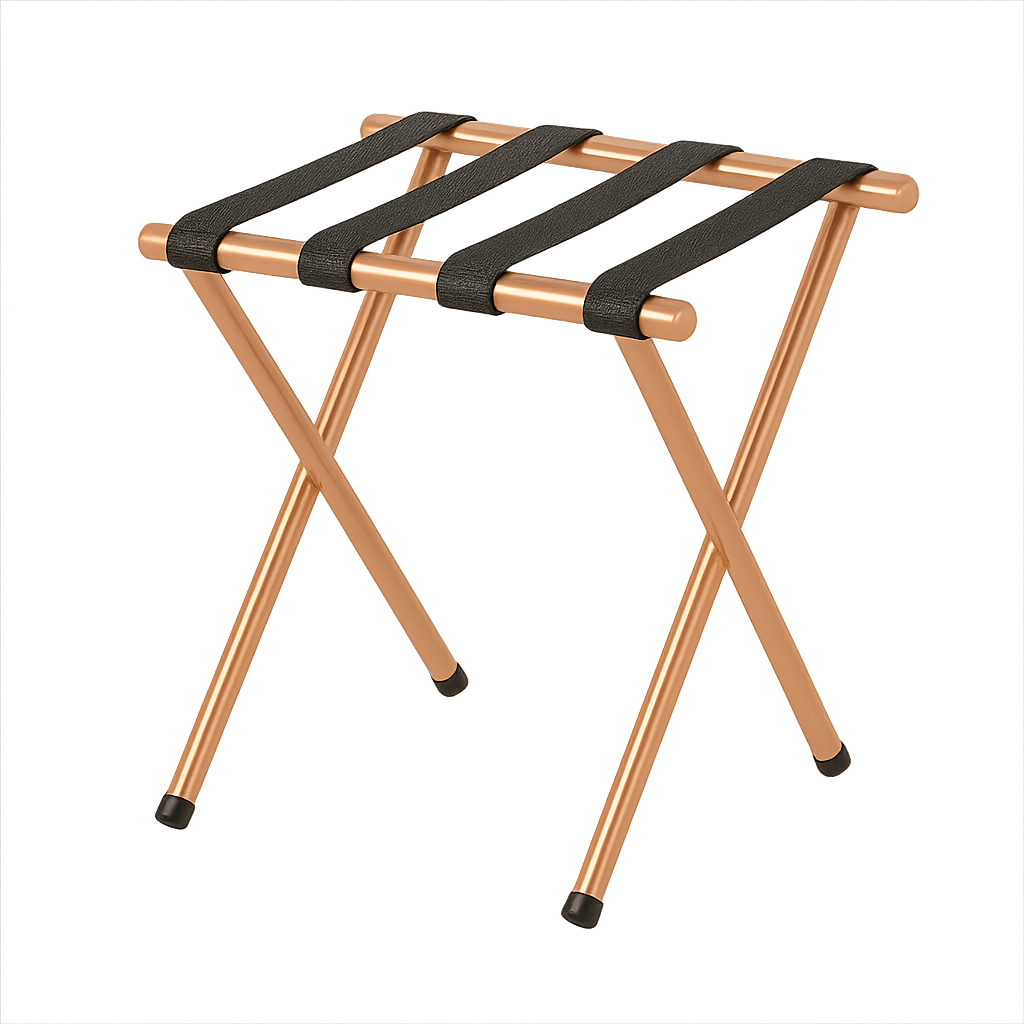 53,5×40,5×81 cm ölçülerinde, katlanabilir metal bakır bavul sehpası. Otel odaları ve misafirhaneler için şık, dayanıklı ve yer kaplamayan lüks valiz standı.