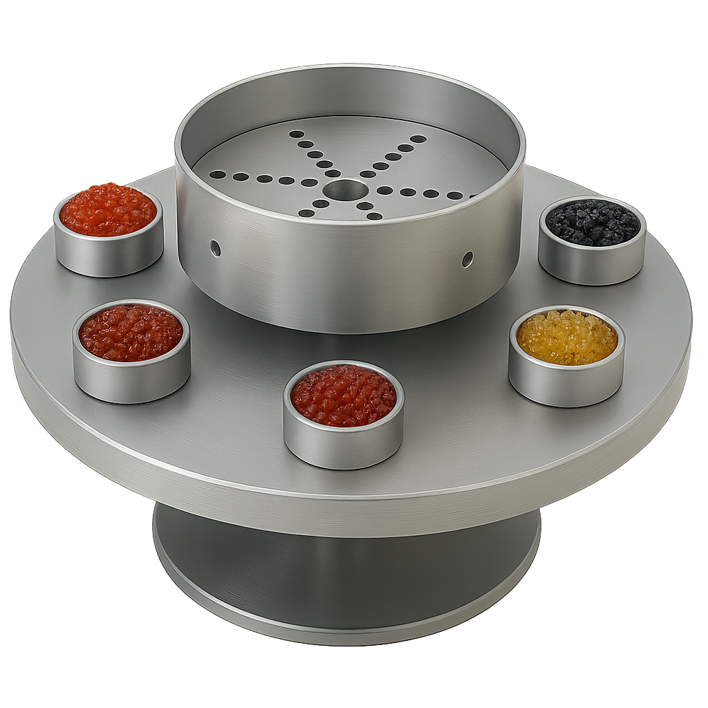 Ana haznenin etrafına yerleştirilen 6 adet küçük yuvarlak kase; farklı havyar çeşitleri, limon dilimleri, kapari, soğan veya özel soslar için ayrılmıştır. Metalik mat gövdesi, renkli havyarların (siyah, kırmızı, turuncu) ışıltısını ön plana çıkarır.
