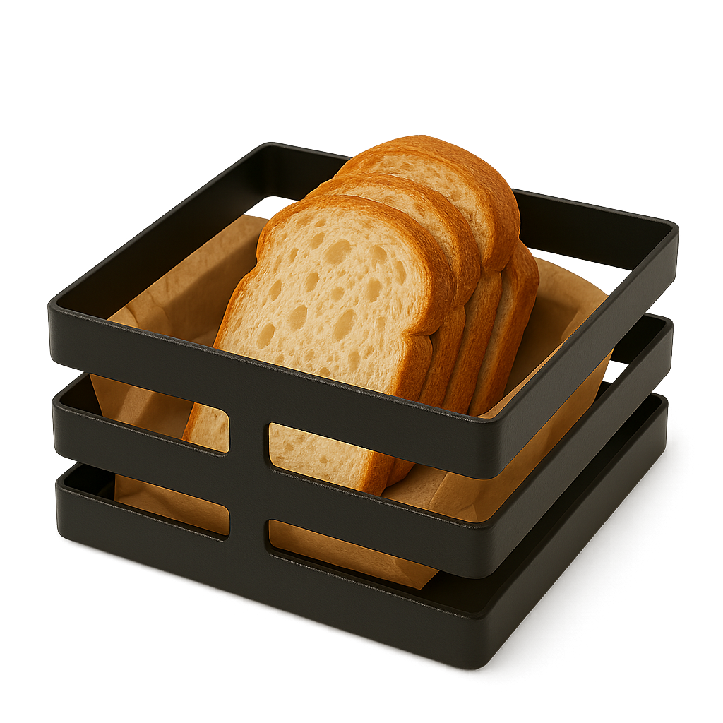 Mat siyah statik boya ile kaplanmış metal gövdesi, yoğun sirkülasyona sahip kafe ve restoranlarda darbelere ve çizilmelere karşı üstün koruma sağlar. Kare tost ekmekleri, dilimlenmiş bagetler veya kahvaltılık hamur işleri için idealdir. Ayrıca, bu minimal tasarımı çatal-bıçak-kaşık (cutlery) seti sunumlarında veya masaüstü düzenleyici olarak da değerlendirebilirsiniz.