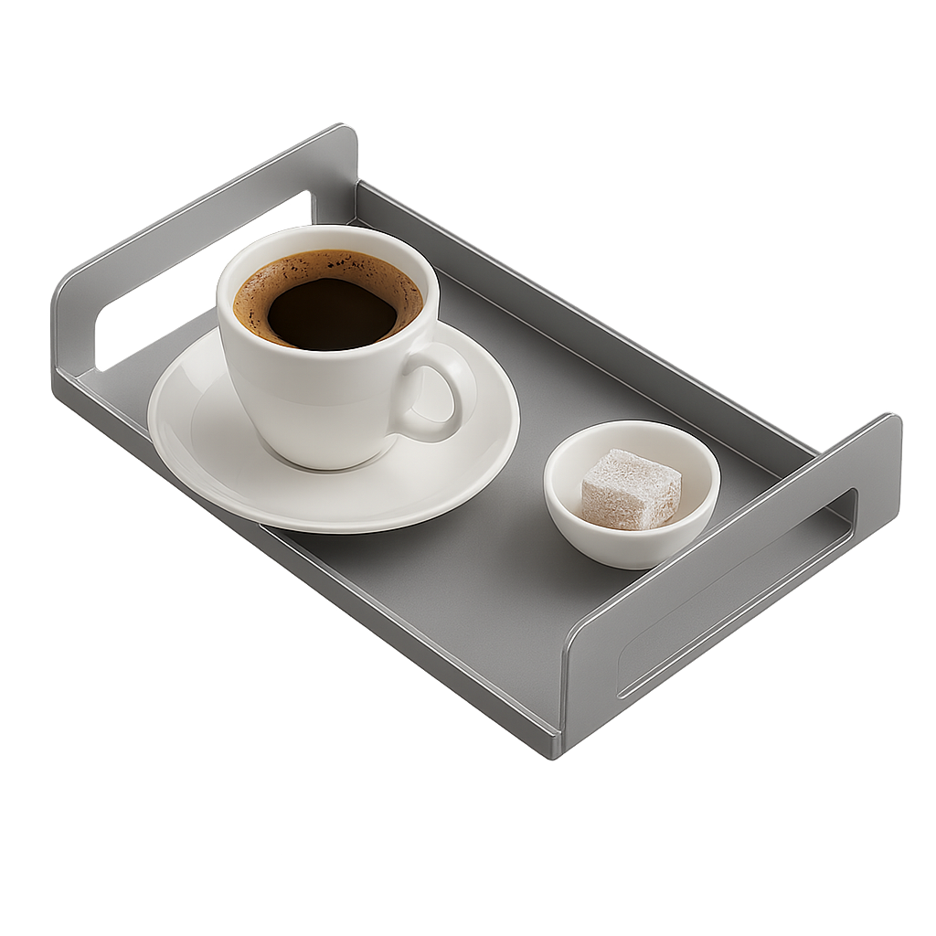 Modern sunumların vazgeçilmezi olan sadelik, Taşpınar Metal’in TSP-2000 ve TSP-2001 kodlu kahve sunum tepsisi modellerinde hayat buluyor. Yanlardan taşan kulplar yerine, tepsinin yükseltilmiş kenarlarına entegre edilmiş oyma (cutout) kulp tasarımı, bu seriye hem kompakt bir yapı hem de mimari bir görünüm kazandırıyor.