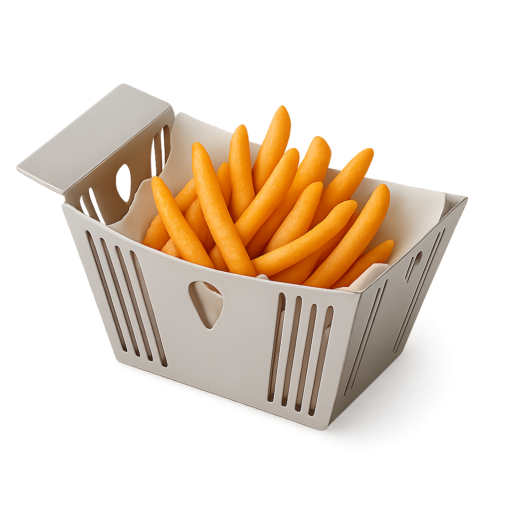 15 cm genişlik ve 11,5 cm derinlik ölçülerine sahip olan bu model, standart kare sepetlere göre daha geniş bir hacim sunar. Bu sayede, sadece patates kızartması değil; soğan halkası, nugget, çıtır tavuk parçaları veya “combo” (karışık) atıştırmalık tabakları için ideal bir servis aracıdır.