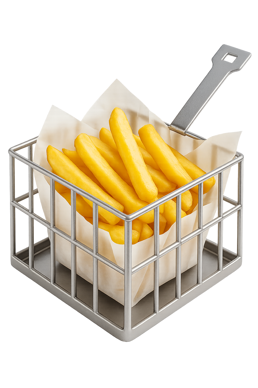 8x8x9 cm ölçülerinde, ergonomik saplı ve derin formlu metal patates sepeti. Uzun kesim patates, churros ve atıştırmalıklar için hava aldıran tel ızgara tasarımlı şık sunum ekipmanı.