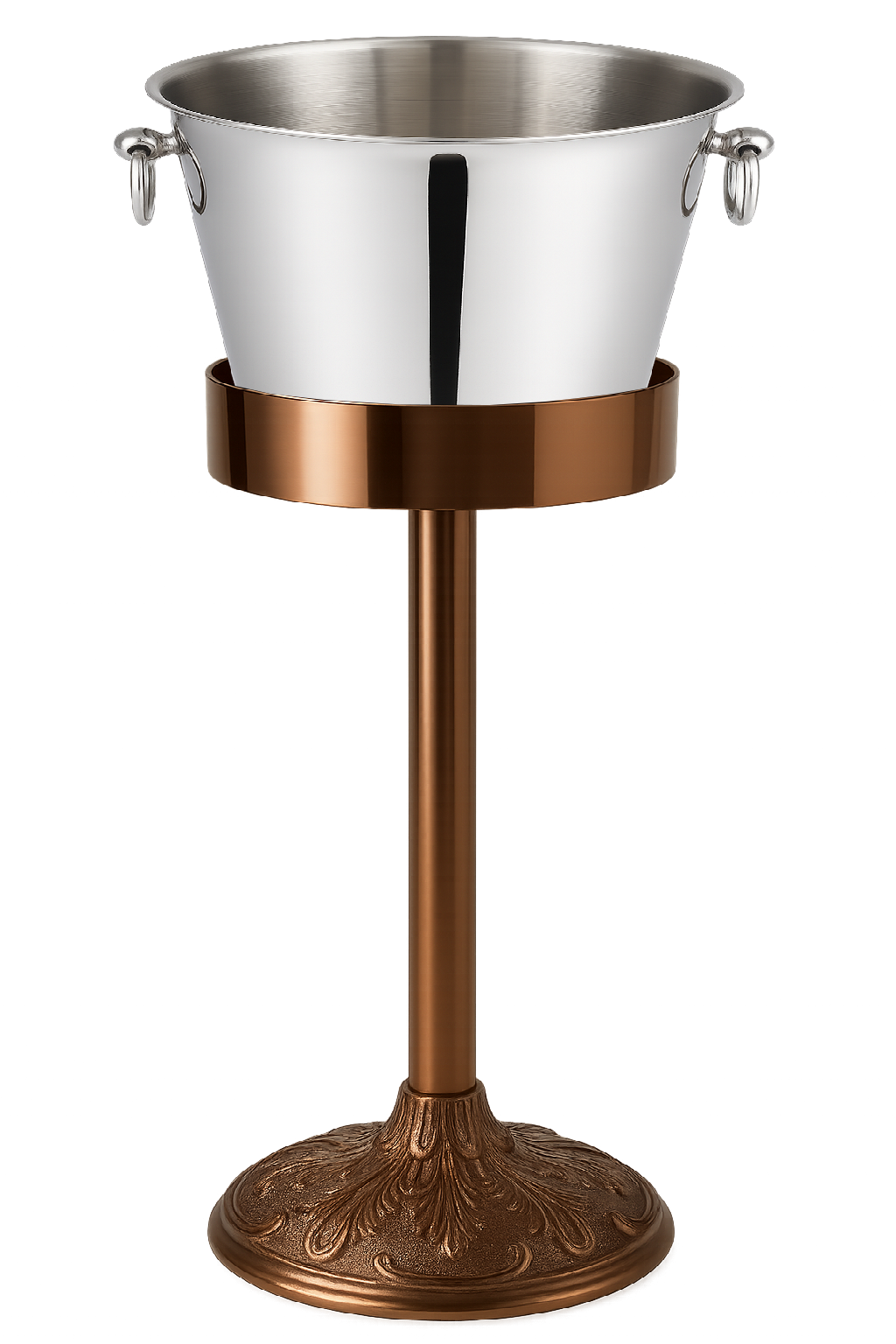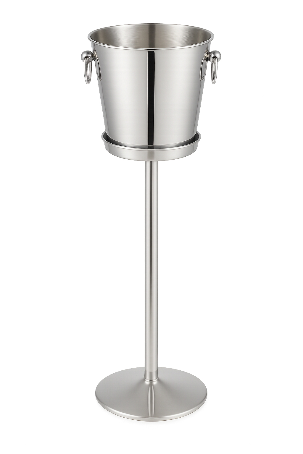 Geniş ve ağır taban yapısı, standın devrilmesini önleyerek güvenli bir kullanım sunar. Üst kısmındaki derin hazne, standart şampanya buz kovalarını sıkıca kavrar ve sabit tutar. (Not: Kova genellikle haricen satılır veya setin bir parçası olabilir, görseldeki kova ile uyumludur).